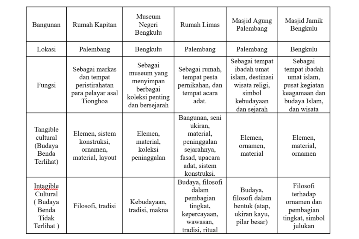 Rumah Kapitan juga mencerminkan kuatnya pengaruh komunitas Tionghoa melalui penggunaan courtyard, material tertentu, warna merah, dan simbol matahari, sementara Masjid Jamik Bengkulu menunjukkan akulturasi melalui atap bertingkat melengkung dan ornamen interior khas.